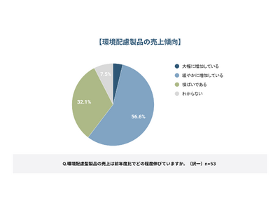 環境配慮型製品の売上が前年度比で「増加している」と回答した割合は、合計で60.4%と半数を超えた。「横ばいである」の32.1%を合わせると、全体の9割以上(92.5%)が売上の維持または拡大を実現している。さらに「減少している」との回答は0社であり、市場全体が堅調に推移していることがうかがえる。