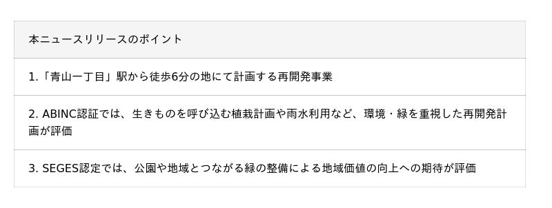 野村不動産株式会社(本社:東京都港区/代表取締役社長:松尾大作、以下「当社」)は、日鉄興和不動産株式会社(本社:東京都港区/代表取締役社長:三輪正浩)とともに参加組合員として、東京都港区赤坂七丁目にて権利者の皆さまをはじめ、地域の皆さまおよび東京都、港区と推進しております『赤坂七丁目2 番地区第一種市街地再開発事業(以下、本事業)』が、一般社団法人いきもの共生事業推進協議会が評価する「ABINC認証」、公益財団法人 都市緑化機構が認定する「SEGES 認定」を取得いたしましたのでお知らせします。