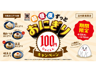 新おにぎり登場を記念して、資さんうどん86店舗で、4/23(木)~5/13(水)の期間限定で「おにぎり100円キャンペーン」を開催します!