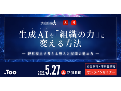クリエイティブ市場の総合商社・株式会社Too(本社/東京都港区虎ノ門3-4-7、社長/石井剛太、以下Too)は、オンラインセミナー「生成AIを「組織の力」に変える方法 - 経営視点で考える導入と展開の進め方 - 」を2026年5月27日(水)に開催します。本セミナーでは、生成AIを個人活用から組織活用へ進めるために必要な考え方と、企業が直面するリスクや懸念点を実践的に紐解きます。