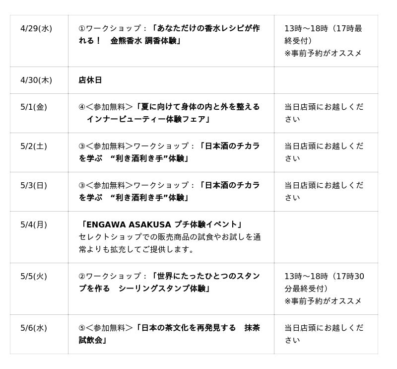 「ENGAWA ASAKUSA(エンガワ アサクサ)」は、4月29日(水)~5月6日(水)のゴールデンウィーク期間中に、全5種の体験イベントを店舗にて開催します。日常ではなかなか巡り合えない“調香体験”や“シーリングスタンプ”を制作するワークショップをはじめ、“日本酒”、“抹茶”をテーマとした体験会など、日本全国の事業者をお招きし、本格的な日本文化を体験できるイベントをご用意しました。
