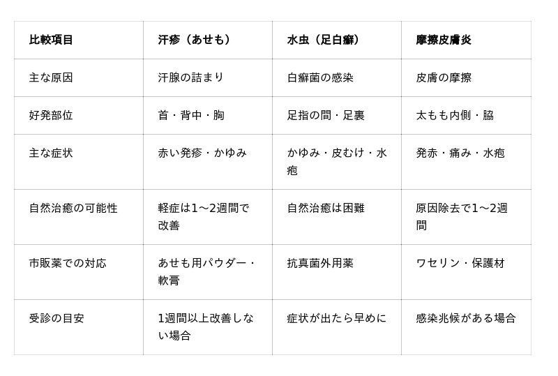 A. 軽い汗疹は市販薬で対応可能ですが、水虫や1週間以上改善しない症状は皮膚科受診をお勧めします。