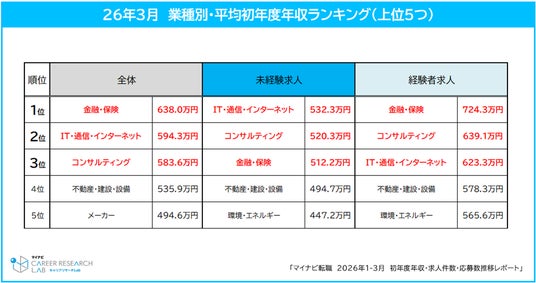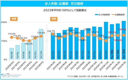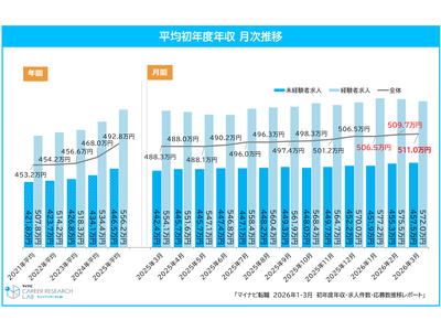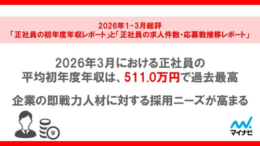 https://tenshoku.mynavi.jp/)は、「正社員の平均初年度年収推移レポート」と「正社員求人件数・応募数推移レポート」について、2026年1-3月の総評を発表しました。本調査は、総合転職情報サイト『マイナビ転職』に掲載された求人の「平均初年度年収※1(未経験※2・経験者※3求人別)」、「求人件数・応募数」の推移を調査したものです。
