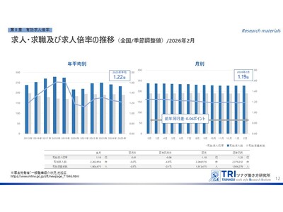 RPO(採用業務代行)・採用コンサルティングを行う株式会社ツナググループ・ホールディングス(本社:東京都中央区、代表取締役兼執行役員社長:米田 光宏)を母体とする、多様な働き方の調査研究機関「ツナグ働き方研究所(拠点:東京都中央区、所長:大野 博司)」は、官公庁などが発表する労働市場関連のデータをキュレーションしつつ、分かりやすくまとめた「労働市場データレポート」を毎月発表しています。今回は3月下旬に発表された最新データをもとに、2026年2月度のレポートについて、とりまとめましたのでご報告いたします。
