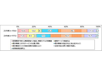 DX推進の目的に関して、最も割合の高かった「既存事業のコスト削減」は、前年度から6.0ポイント減少し36.1%となりました。それに対し、「既存事業の収益力向上」(20.3%)、「新規事業や新たな事業領域への進出」(13.5%)などが増加しており、業務効率化などの「守りの DX」から、新規事業創出や収益拡大などを目指す「攻めの DX」へと企業の意識が移りつつあることがうかがえます。(図1)