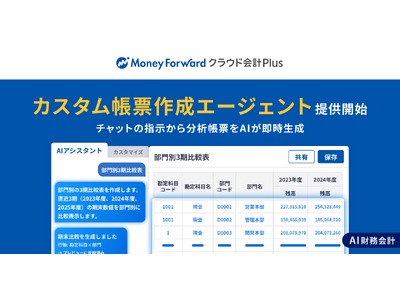 株式会社マネーフォワードは、『マネーフォワード クラウド会計Plus』において「カスタム帳票作成エージェント」※1を提供開始します。本エージェントは、チャットの指示から分析帳票をAIが即時生成※2します。これにより、各種帳票作成や月次決算後の異常検知などにかかる工数を大きく削減します。