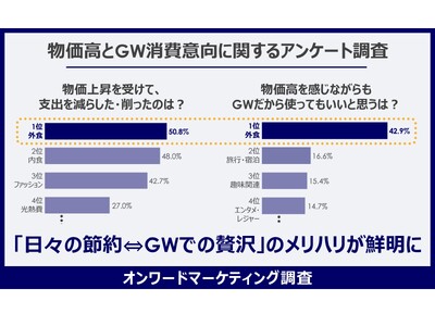 「外食」は、物価高で削った消費のトップ(50.8%)でありながら、「GWだから使ってもいい消費」でも1位(42.9%)になり、日常では節約しながらも、GWという特別機会に集中して使う「メリハリ消費」の実態が明らかになりました。