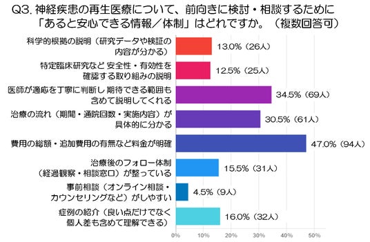 また、再生医療に寄せられている期待は、単に新しい治療としての目新しさだけではなく、今ある治療やリハビリを支える選択肢としての現実的な希望に向けられていました。症状そのものへのアプローチに加えて、日常生活の負担や家族の不安が少しでも軽くなることを望む声が見られた点も印象的です。その一方で、前向きに考えるためには、費用や治療の流れ、どこまで期待できるのかといった、具体的でわかりやすい情報が欠かせないと考えられていることもわかりました。