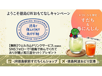 本キャンペーンでは、徳島駅前「すだちくんショップ」と「徳島阿波おどり空港」に特設ブースを構え、今が旬の「春にんじん」と、徳島県が生産量日本一の「すだち」を贅沢に使用したウェルカムドリンクでお出迎えします。