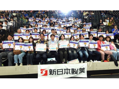 新日本製薬 株式会社(本社:福岡市、代表取締役社長CEO:後藤孝洋)は、2026年4月18日(土)に行われたライジングゼファーフクオカの横浜エクセレンス戦へ、福利厚生の一環として社員とそのご家族・ご友人を招待。2026年度新入社員も参加し、歓迎・交流の場といたしました。当日は「桜とともに勝利の花を咲かせよう!」というテーマで作成したオリジナル応援グッズを配布し、総勢約80名で観戦いたしました。