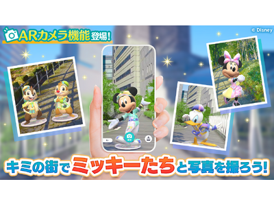 スマートフォンのカメラを通して、現実の風景にミッキー&フレンズのフィギュアを出現させることができる「ARカメラ撮影機能」が新たに登場しました。位置情報ゲームならではの没入感が高い機能となっており、お気に入りのお出かけスポットや何気ない日常の風景にキャラクターを呼び出して、あなただけの特別な写真撮影をお楽しみいただけます。