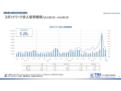 2026年2月度のスポットワーク求人倍率は3.26倍となりました。1月・2月にスポットワークの求人数が落ち着くのは例年通りの結果ですが、求人数は前月比17.4%減となり、求人の需要がピークとなる12月と比べて5.99ポイントも下落しました。一方、前年同月からは1.82ポイント上昇しています。