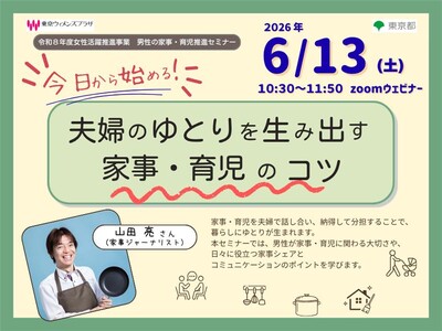 家事・育児を夫婦で話し合い、納得して分担することで、暮らしにゆとりが生まれます。本セミナーでは、男性が家事・育児に関わる大切さや、日々に役立つ家事シェア・楽家事のコツとコミュニケーションのポイントを学ぶことができます。ぜひご参加ください!