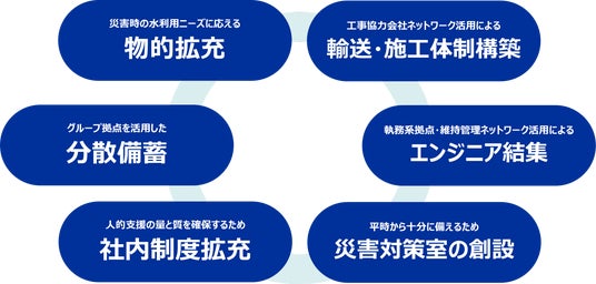 「水支援オペレーション体制」は、災害時の水利用ニーズに応える装備の拡充に加え、物資の備蓄・配備の分散、輸送・設置・施工を担う協力体制の整備、全国のフィールドエンジニアが即応的に集結して支援を担う仕組み、そして支援を統括する災害対策室の常設、社内制度・研修の拡充など、水を届けるための一体的な体制を構築しています。