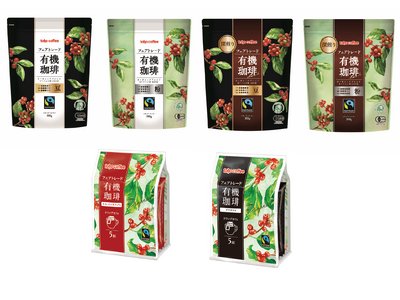 左上からフェアトレード有機珈琲(豆)、同(粉)、フェアトレード有機珈琲ダーク(豆)、同(粉)、ドリップカフェ フェアトレード有機珈琲モカ・イルガチェフェ、同グアテマラ