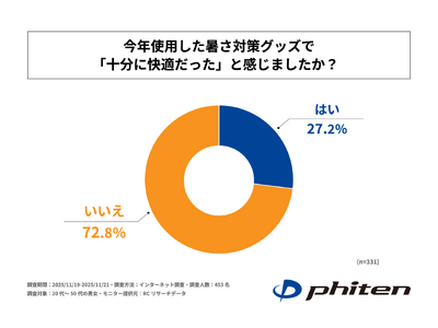 また、2025年の夏が観測史上最も暑かったと感じた人に「今年使用した暑さ対策グッズで“十分に快適だった”と感じたか」を尋ねる設問への回答では、「いいえ」が72.8%、「はい」が27.2%という結果になりました。この結果から、2025年の夏が観測史上最も暑かったと感じた人の7割以上が、今年使用した暑さ対策グッズでは十分な快適さを得られなかったことがわかりました。
