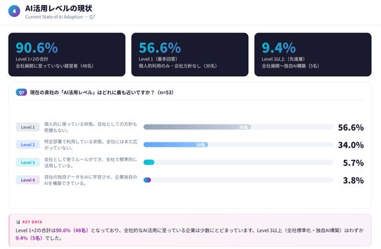 AI活用レベルについての設問。90.6%(48名)が"全社展開"に至っていない。