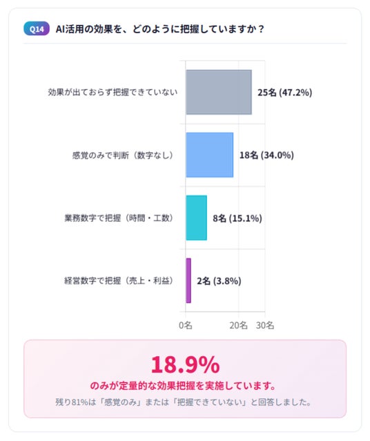 「効果がまだ把握できていない」または「感覚で判断している」と回答した経営者は合計で81%超。業務数字(時間・工数)で把握できているのは15.1%、経営数字(売上・利益)で把握できているのはわずか3.8%(2社)です。