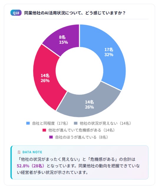 「他社の状況がまったく見えない」26.4%+「他社が進んでいて危機感がある」26.4%=合計52.8%が、業界内の情報非対称性に不安を抱えていることが分かりました。