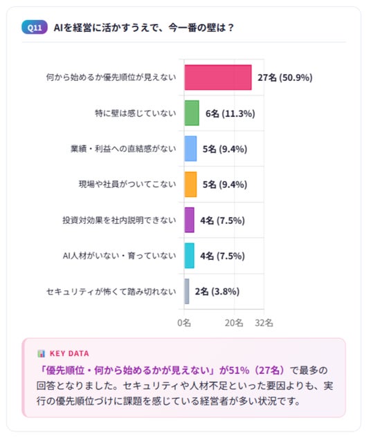 また、「AIを経営に活かすうえで、今一番の壁は何か」という問いに対し、