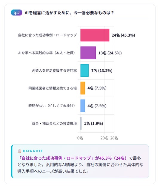 最多は「自社に合った成功事例・ロードマップ」45%(24社)、次いで「AIを学べる実践的な場(自分・社員)」24.5%(13社)でした。