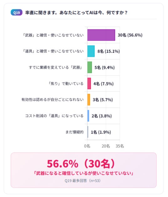 56.6%(30名)が「武器になると確信しているが、使いこなせていない」と回答。「すでに業績を変えている武器」とした経営者は9.4%にとどまります。