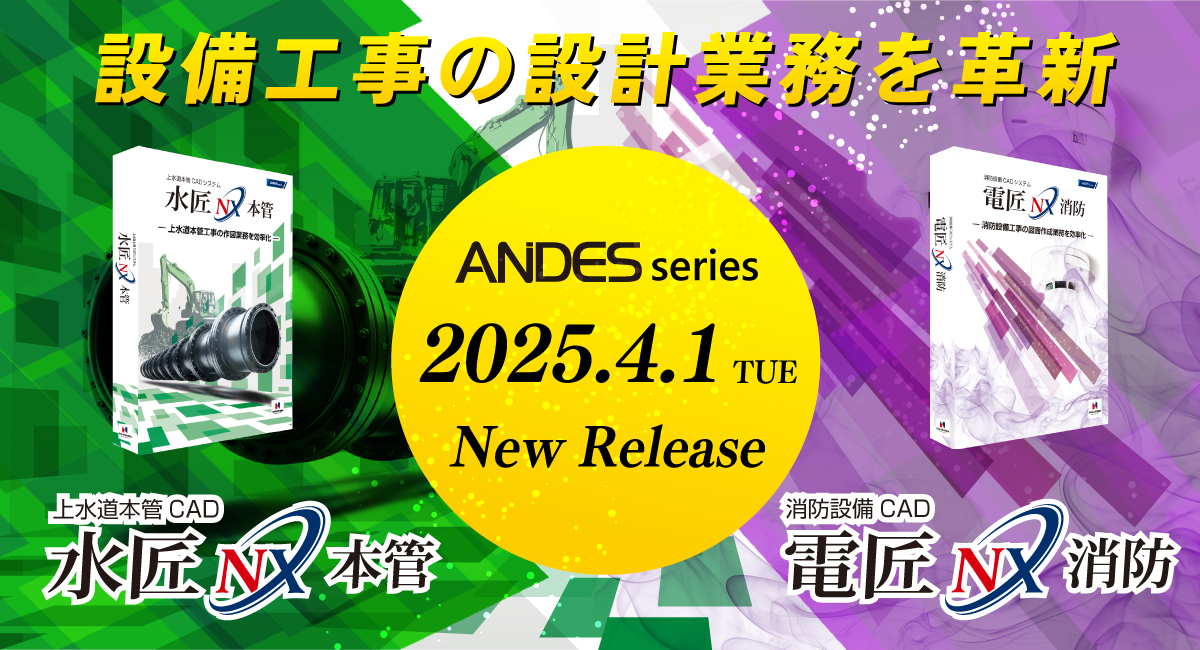 株式会社システムズナカシマ(本社:岡山県岡山市、代表取締役社長:中島義雄)は、創業当初(1983年)から開発・販売しているANDES CADシリーズの新製品として、消防設備業向けCADシステム『電匠NX消防』と上水道本管工事用CADシステム『水匠NX 本管』を4月1日に発売します。