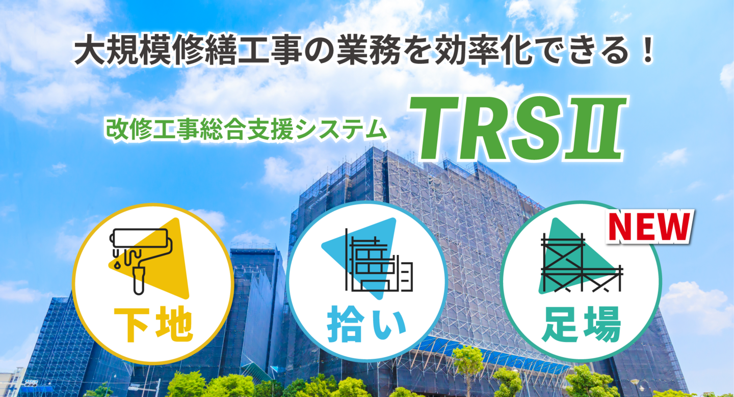 株式会社システムズナカシマ(本社:岡山県岡山市、代表取締役社長:中島 義雄)は、ビル・マンションなどの大規模修繕工事を行う事業者向けに、改修工事総合支援システム『TRSⅡ』シリーズの第3弾『TRSⅡ 足場』を2025年6月2日に発売します。2023年に提供を開始した『TRSⅡ 下地』『TRSⅡ 拾い』に続き、新たに足場仮設計画機能を搭載した『TRSⅡ 足場』を加えることで、工事の図面作成から数量積算まで、改修工事全体のDXを推進します。