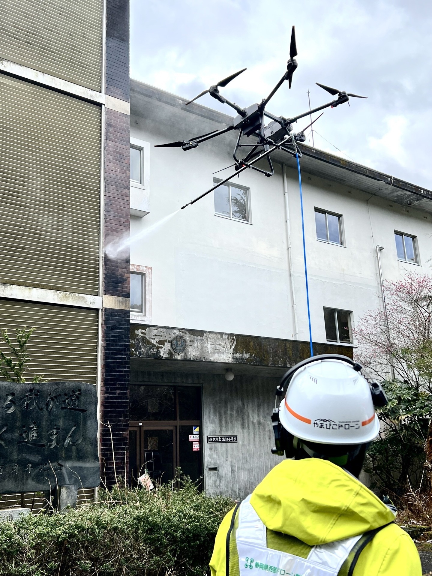 ・ドローン×高圧洗浄機!高所の外壁や看板の汚れを洗い落とすサービス「ドローン高所洗浄」